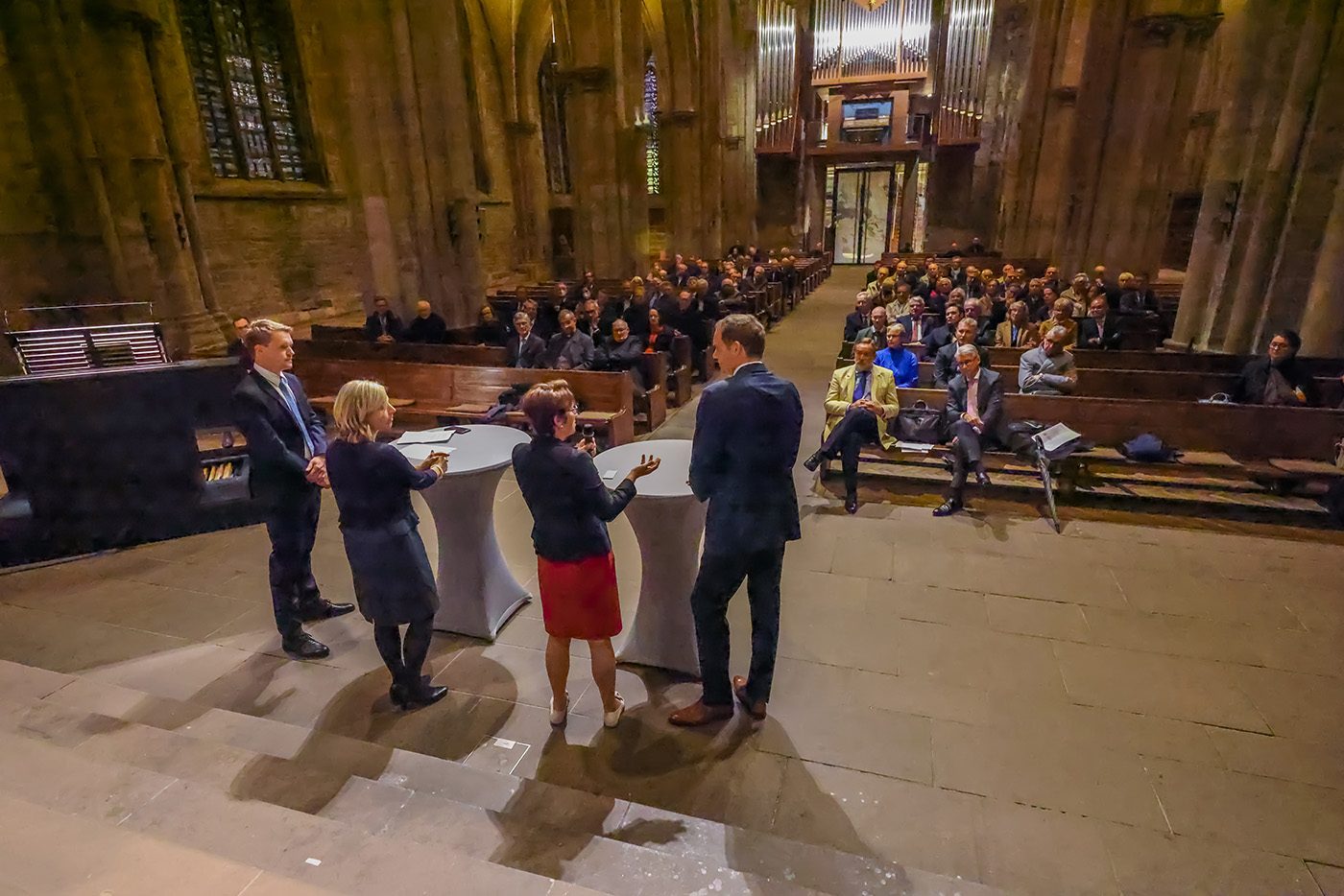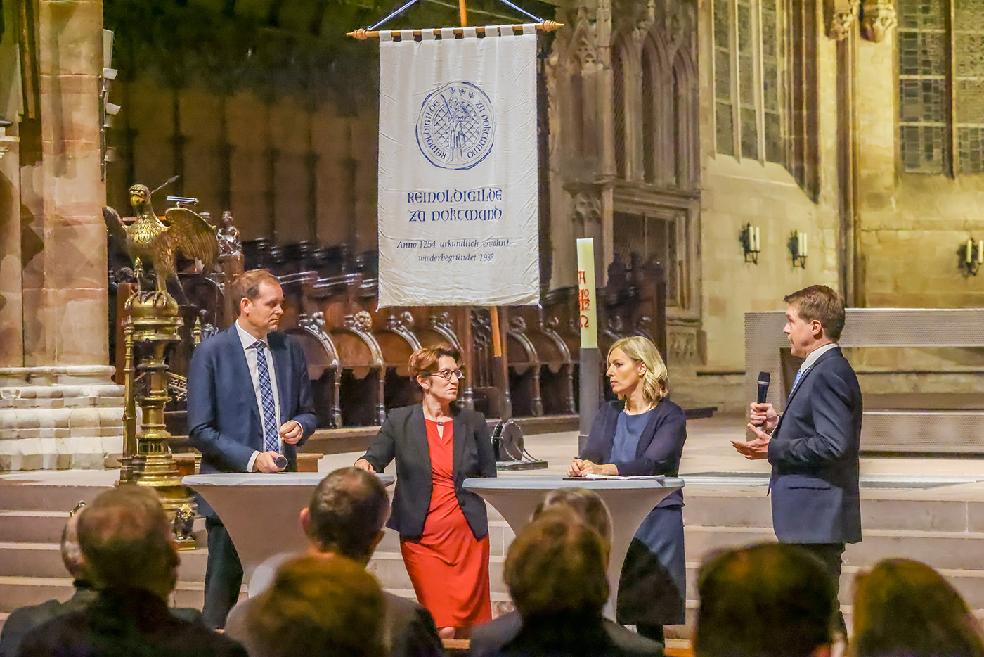 Beim Herbstempfang der Reinoldigilde am 3. November 2022 in der Ev. Stadtkirche St. Reinoldi haben unter Moderation von Matthias Langrock (Mitglied der Chefredaktion der RuhrNachrichten) die Mitglieder der Meisterrunde der Reinoldigilde Heike Heim (Vorsitzende der Geschäftsführung DEW21), Katrin Lauterborn (Geschäftsführerin Ökumenische Wohnungslosen-Initiative e.V. „Gast-Haus statt Bank“) und Peter Brasse (Geschäftsführer Unternehmensverbände für Dortmund und Umgebung) über „Folgen der Energiekrise für Mensch und Wirtschaft“ diskutiert.