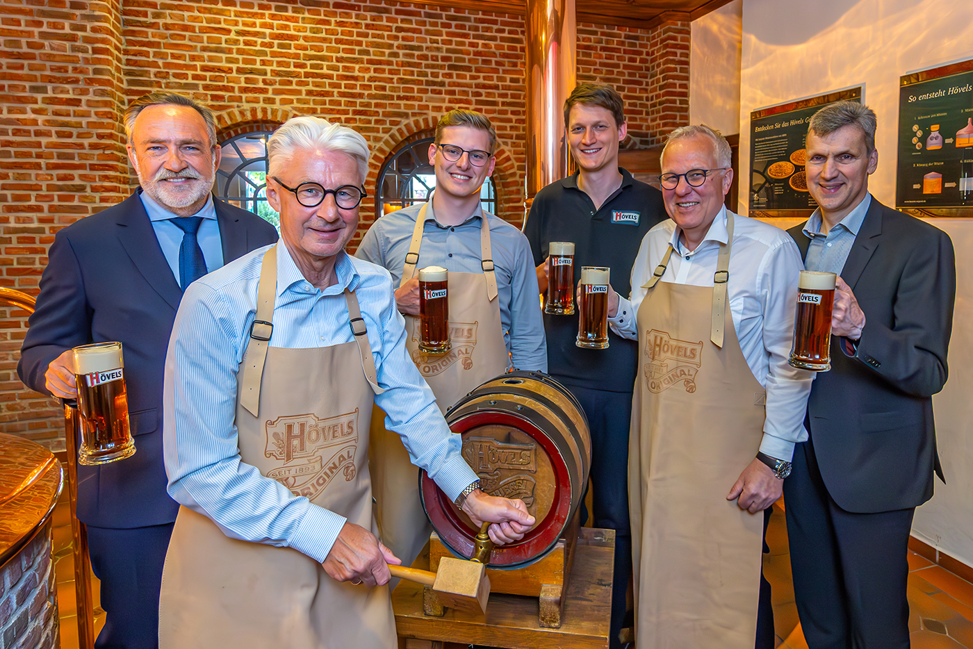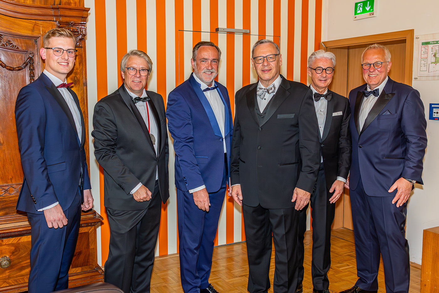 Großes Bild – v.l.n.r.: Christoph Schubert (Richtemann), Christian Sprenger (Sprecher der Ehrenmeisterrunde), Markus Wesselbaum (Sponsor des Reinoldimahls 2025), Florian Wesselbaum (Sponsor des Reinoldimahls 2025), Dr. Thomas Gößmann (Festredner), Thomas Westphal (Oberbürgermeister der Stadt Dortmund), Wolfgang Scharf (ehemaliger Obermeister)